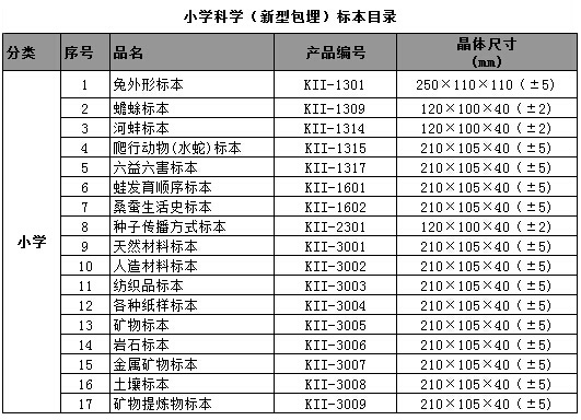 中小學(xué)標準配備系列包埋標本涵蓋了國家中小學(xué)標準配備標本要求的所有標本品種,包括植物外形、植物生活史、植物結構、動(dòng)物外形、動(dòng)物生活史、動(dòng)物結構、動(dòng)物骨骼、動(dòng)物解剖,礦物等標本產(chǎn)品。產(chǎn)品符合國家教育部行業(yè)標準、企業(yè)標準、以及行業(yè)通行的安全標準,與教學(xué)大綱緊密配套,是中小學(xué)自然生物課堂的直觀(guān)教材和先進(jìn)教學(xué)用具。