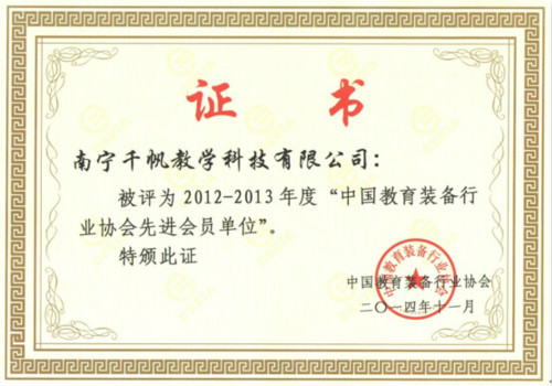 中國教育裝備行業(yè)協(xié)會(huì)先進(jìn)會(huì)員單位證書