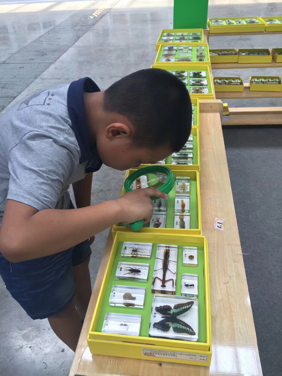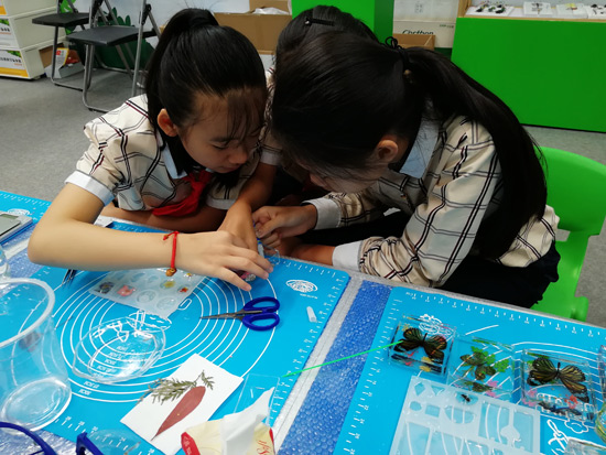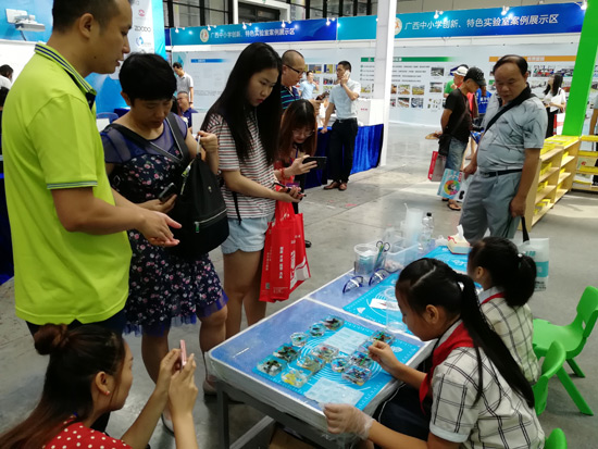 展會現(xiàn)場-工作人員給來訪人員介紹DIY學生實驗制作解決方案產品及學生們展示DIY制作標本